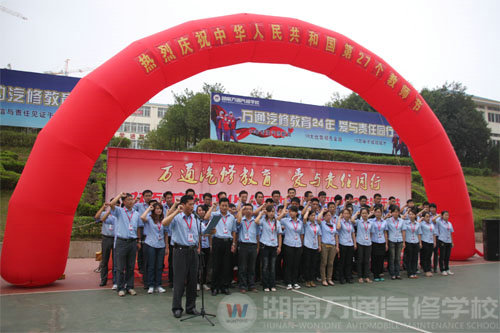 “我莊嚴(yán)宣誓:我是湖南萬通汽車學(xué)校的一名光榮教師/深知教書育人是我神圣的職責(zé)/學(xué)高為師 身正為范 是我一生的追求/我將盡我所能/恪盡職守 嚴(yán)謹(jǐn)治學(xué) 愛生敬業(yè)/用高尚的人格魅力引領(lǐng)學(xué)生的人格/湖南萬通 培育汽修人才的搖籃/辦中國最好的職業(yè)教育是我的理想/我將在此鑄就輝煌人生”