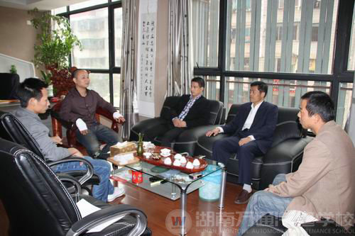 剛走進企業(yè),專業(yè)的前臺接待,略帶復(fù)古而有點自然氣息的木質(zhì)座椅,不同時期的紅酒放置于酒架上,水池之上的木質(zhì)階梯;擺放整齊被分門別類好的書,擺放整齊的汽車零配件,整個環(huán)境專業(yè)、溫馨、而又愜意。“潘總啊,剛進來我就被你這里的酒文化、茶文化、汽車文化所感染了,他們?nèi)诤戏浅5暮茫覀兊膶W(xué)子能在這樣的環(huán)境工作真的很不錯,相信他們在這里也會成長的更快”陳督導(dǎo)感嘆道。在潘總的陪同下,蔡助理、陳督導(dǎo)一行對企業(yè)的環(huán)境進行了參觀,看到專業(yè)的化的作業(yè)車間,陳督導(dǎo)表示,以后學(xué)校也將盡力朝企業(yè)方向靠,讓學(xué)校的學(xué)子在學(xué)校感覺在上班一樣。