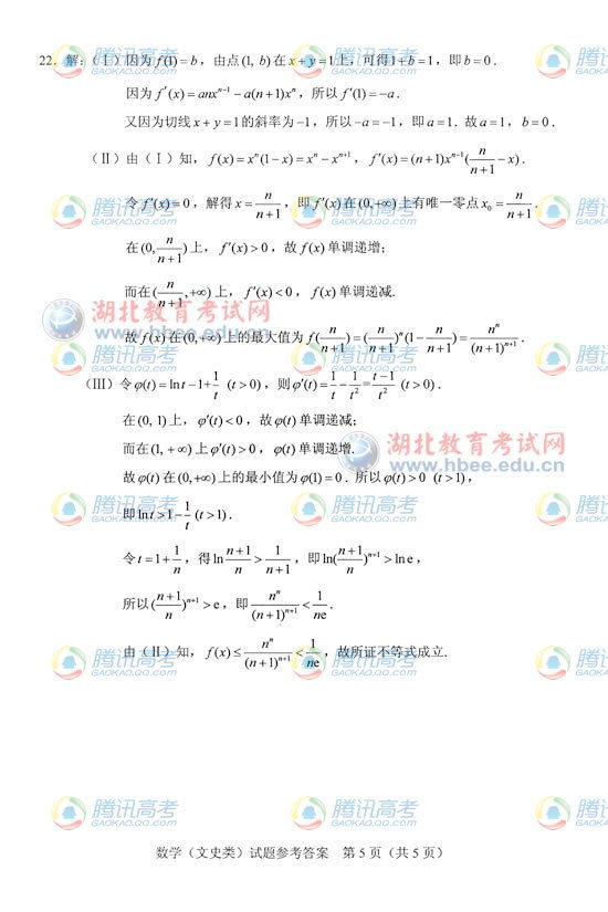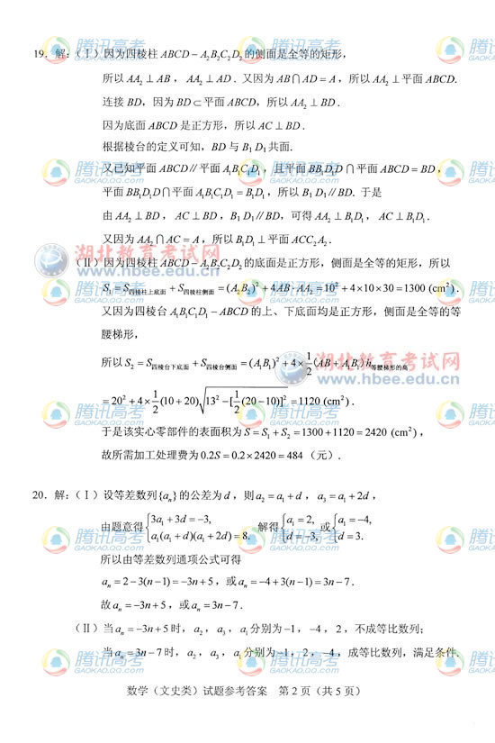 2012年湖北高考文科數(shù)學(xué)答案