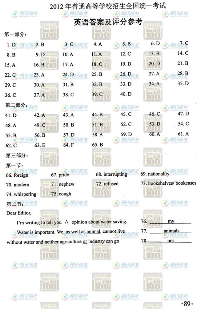 文章導(dǎo)讀:已經(jīng)發(fā)布由國(guó)家公布的2012年貴州高考英語(yǔ)答案,此答案包含試題以及答案和解析。更多貴州高考答案和試題請(qǐng)進(jìn)入查看。
