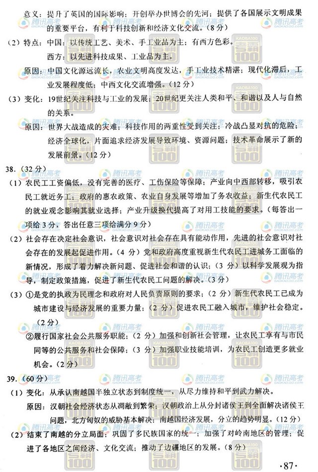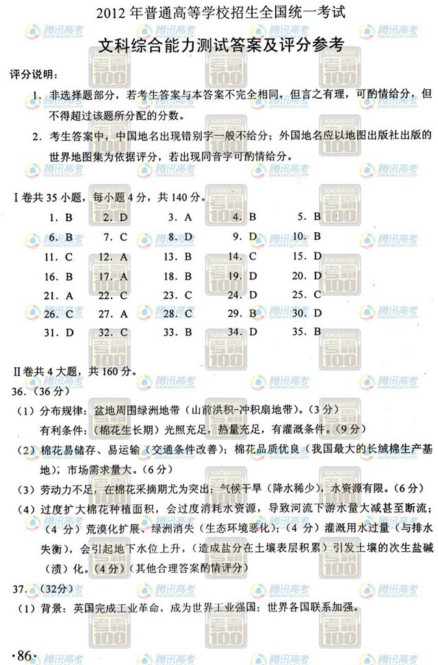 2012年貴州高考文科綜合答案