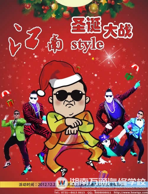 2012年火爆全球的是什么?在回答這個問題時,很多人會理所當然的想到風靡全世界的神曲“江南style”。憑借著別具一格的舞步、嘻哈搞笑的表演與極具感染力的節(jié)奏,江南style成為今年最流行的時尚范兒,它不僅受到年輕人的追捧,也吸引了中老年人的目光,可謂是“老少皆愛”。而與此同時,為豐富校園文化,活躍校園氛圍,展示師生風采,塑造萬通學子活力十足的形象,湖南萬通汽車學校緊跟社會潮流,在圣誕節(jié)到來之際,特舉辦“激情圣誕,活力萬通”的“江南style”創(chuàng)意潮舞大賽。