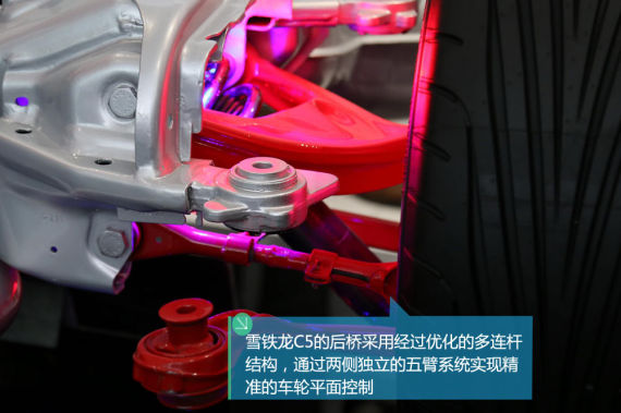 雪鐵龍C5的后橋采用經(jīng)過(guò)優(yōu)化的多連桿結(jié)構(gòu),通過(guò)兩側(cè)獨(dú)立的五臂系統(tǒng)實(shí)現(xiàn)精準(zhǔn)的車輪平面控制,擁有良好地操控性能。