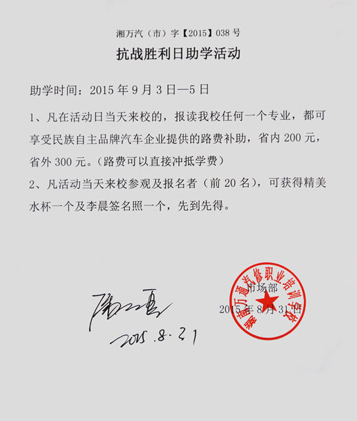 今年的9月3日是中國(guó)人民抗日戰(zhàn)爭(zhēng)暨世界反法西斯戰(zhàn)爭(zhēng)勝利70周年,為了讓全國(guó)人民能全力的參與到當(dāng)天的紀(jì)念活動(dòng)中,特此國(guó)務(wù)院批準(zhǔn)全國(guó)放假1天。但在湖南萬(wàn)通汽修學(xué)校,為了保障各位立志于學(xué)汽修技術(shù)的有志青年入學(xué)之路能暢通無(wú)阻,特此在9月3日至5日這三天內(nèi),全體教師依然在就職崗位上,熱情飽滿地為前來(lái)咨詢與報(bào)名的學(xué)子提供各類服務(wù)。
