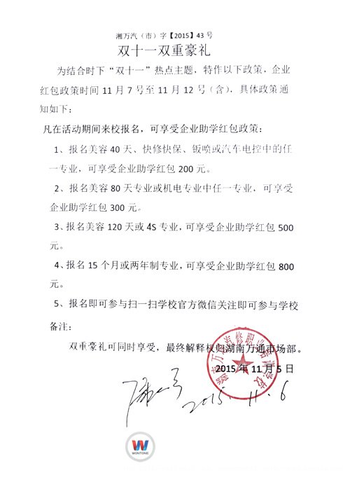 激動人心的“雙十一”風(fēng)暴即將席卷整個中華大地,這次,我們湖南萬通也來猛的,超大紅包放送,優(yōu)惠時間從11月7日一直持續(xù)到11月12日,名額有限,先到先得!親,趕緊來湖南萬通報名搶大紅包吧!詳細請咨詢:0731—86158615.
