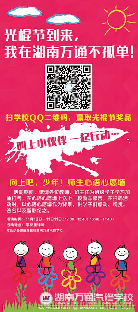 光棍節(jié)到來了,我們在湖南萬通不孤單!各位在校的老師與學子們,在平日里,各自為了能傳授與學好汽修技術,多番操勞,常為此而廢寢忘食,但在學習與工作之余,也需要適度地舒緩學習、放松心情,再以百分之一百二十的熱情去投入學與教中,攜手同行,共創(chuàng)美好校園。所以,好事再說一遍,趕緊來活動活動簽署心語心愿墻,掃碼豐厚禮品吧!請記住,我們的這場美麗地約會哦!