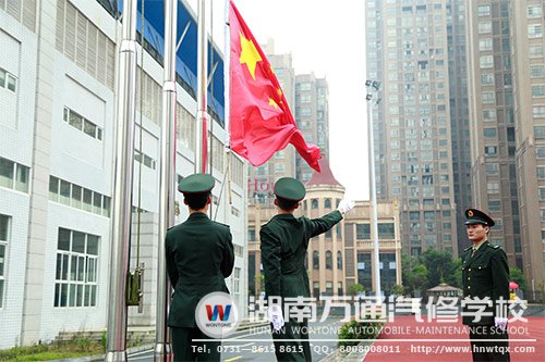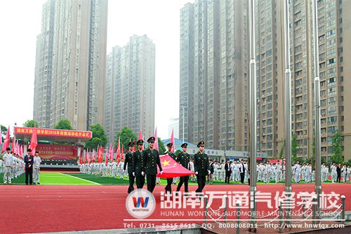 全校師生齊聚運(yùn)動場,原本寂靜的賽場一下子熱鬧起來。8點(diǎn)整,學(xué)校韓助慷慨激昂地致完開幕詞,由湖南萬通的退伍軍人班的六名退伍軍人,所組成的國旗隊(duì)進(jìn)行升旗儀式,他們軍容整齊、氣宇軒昂地手持國旗,邁著整齊的步伐,走向國旗桿臺。伴著雄壯的國歌聲響起,湖南萬通汽修學(xué)校全體師生高唱著國歌,目視著五星紅旗冉冉升起。