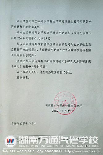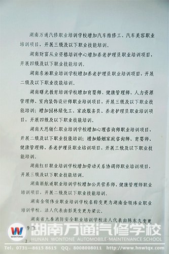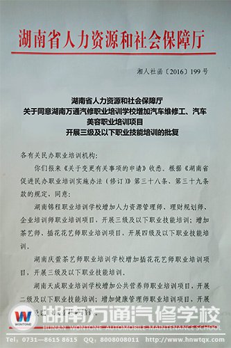湖南省人力資源和社會(huì)保障廳,根據(jù)湖南萬(wàn)通汽修職業(yè)培訓(xùn)學(xué)校所提交的《關(guān)于變更有關(guān)事項(xiàng)的申請(qǐng)》,依據(jù)《湖南省促進(jìn)民辦職業(yè)培訓(xùn)實(shí)施辦法(修訂)》第三十八條、三十九條規(guī)定,同意湖南萬(wàn)通汽修職業(yè)培訓(xùn)學(xué)校增加汽車維修工、汽車美容職業(yè)培訓(xùn)項(xiàng)目開展三級(jí)及以下職業(yè)技能培訓(xùn)。