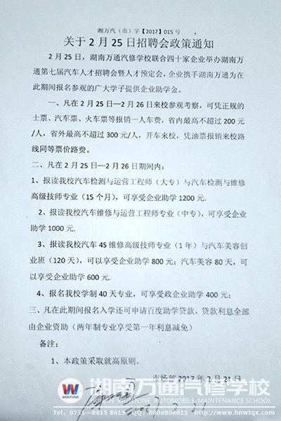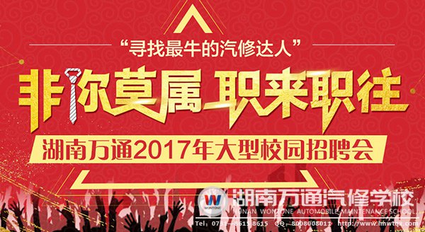 為了更好的做好春季畢業(yè)生的就業(yè)工作,更好的為企業(yè)挑選優(yōu)秀人才,增進(jìn)畢業(yè)生與用人單位的彼此了解,同時(shí)也為企業(yè)與學(xué)校、學(xué)生開展更廣泛的交流建立一個(gè)平臺(tái),湖南萬(wàn)通汽修學(xué)校將于2月25日聯(lián)合四十家企業(yè)舉辦2017年大型春季校園招聘會(huì)。企業(yè)攜手湖南為在此期間報(bào)名參觀的廣大學(xué)子提供企業(yè)助學(xué)金。