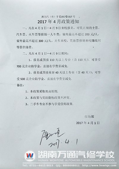 湖南萬通汽修培訓學校四月暖心助學政策驚喜來襲。想學汽車美容裝潢、想擁有一門高新技術(shù)、想創(chuàng)業(yè)的你絕對不要錯過哦!快人一步才能搶占先機,報名熱門汽修好專業(yè),準備迎接新的挑戰(zhàn)。行動改變命運,熱門專業(yè)名額有限,入學前必看!