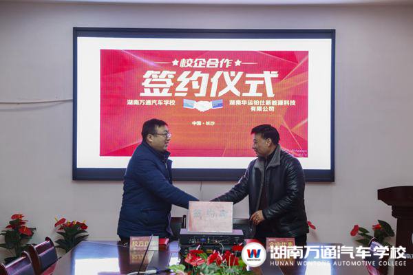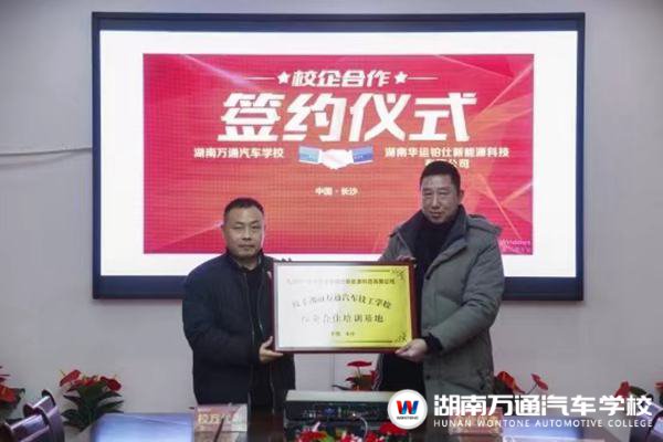 湖南萬通汽車學校校長助理呂助表示,為滿足企業(yè)關于汽車技能人才培養(yǎng)需求,在實踐、開放的基礎上校企之間一定要大力培養(yǎng)創(chuàng)新型人才,培養(yǎng)復合型技能人才,加大產(chǎn)教融合深度發(fā)展。最后,湖南萬通汽車學校與湖南華運鉑仕新能源科技有限公司共同簽署了《校企合作協(xié)議》,并互相授牌“校企合作培訓基地”,正式達成校企合作關系。