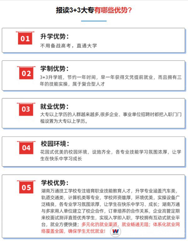 在湖南萬(wàn)通,中考不達(dá)標(biāo)考生可讀職校、技工學(xué)校,通過(guò)報(bào)讀3+3對(duì)口升學(xué),實(shí)現(xiàn)初中生直升大學(xué)夢(mèng)。
