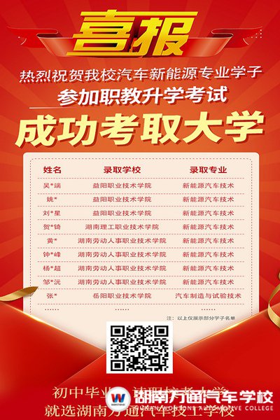 桃李芬芳,育才成林。一直以來(lái),湖南萬(wàn)通堅(jiān)持學(xué)生就業(yè)/升學(xué)為導(dǎo)向,引進(jìn)優(yōu)秀師資隊(duì)伍,緊抓升學(xué)教育。截止2022年5月14日,我校學(xué)生參加湖南省中職單招考試第一批錄取結(jié)果已出爐,恭喜以下汽車新能源專業(yè)學(xué)子參加職教升學(xué)考試,成功考取大學(xué)!