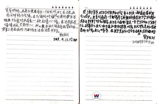 感謝爸爸媽媽對我的關(guān)愛,從小到大一直在保護我們成長,我來萬通有一個多月了,我在這個學校和弟弟交到了很多朋友,在生活方面張克老師也做得十分到位,他十分關(guān)心我們的生活和身體,對我來說,張克老師是我的老師也像我們的爸爸,在這里,我的學習生活正式開始了。 ——曾珍川